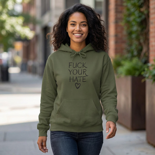 Statement Hoodie — “Fuck Your Hate” Minimal Script Heart